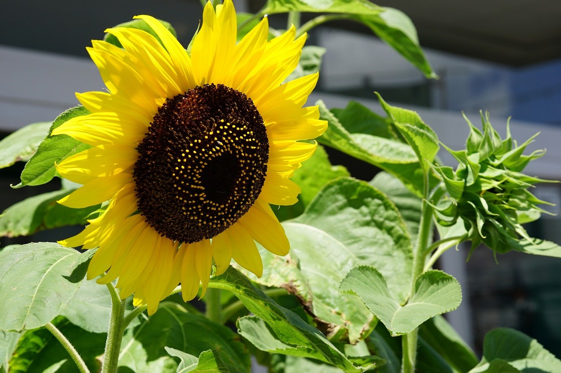一輪のひまわりが当社の玄関前で咲きました。