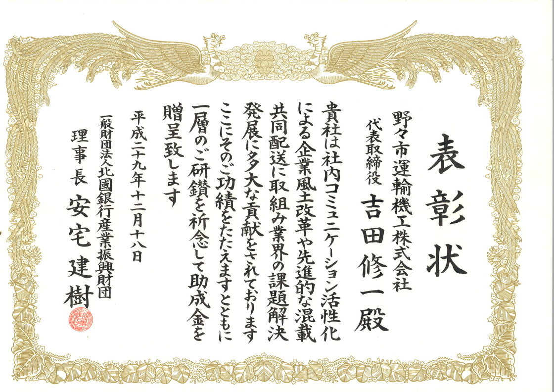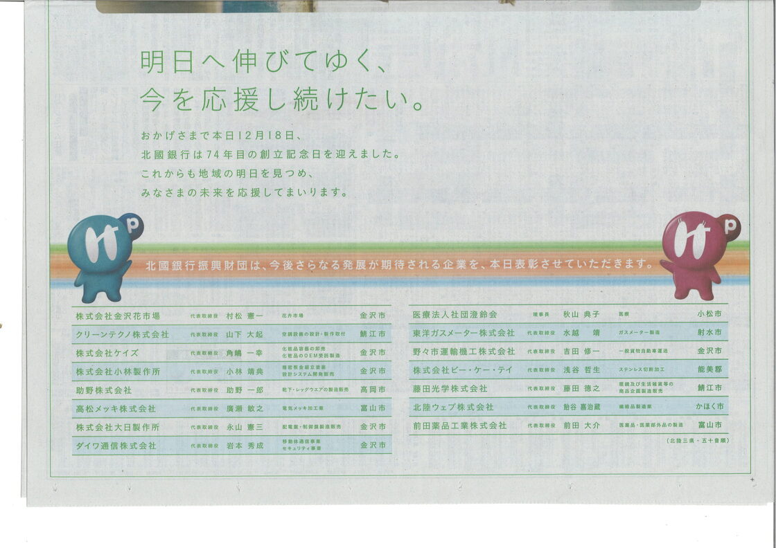 平成29年12月18日北國銀行本店で、北國銀行産業振興財団から当社が表彰されました。
