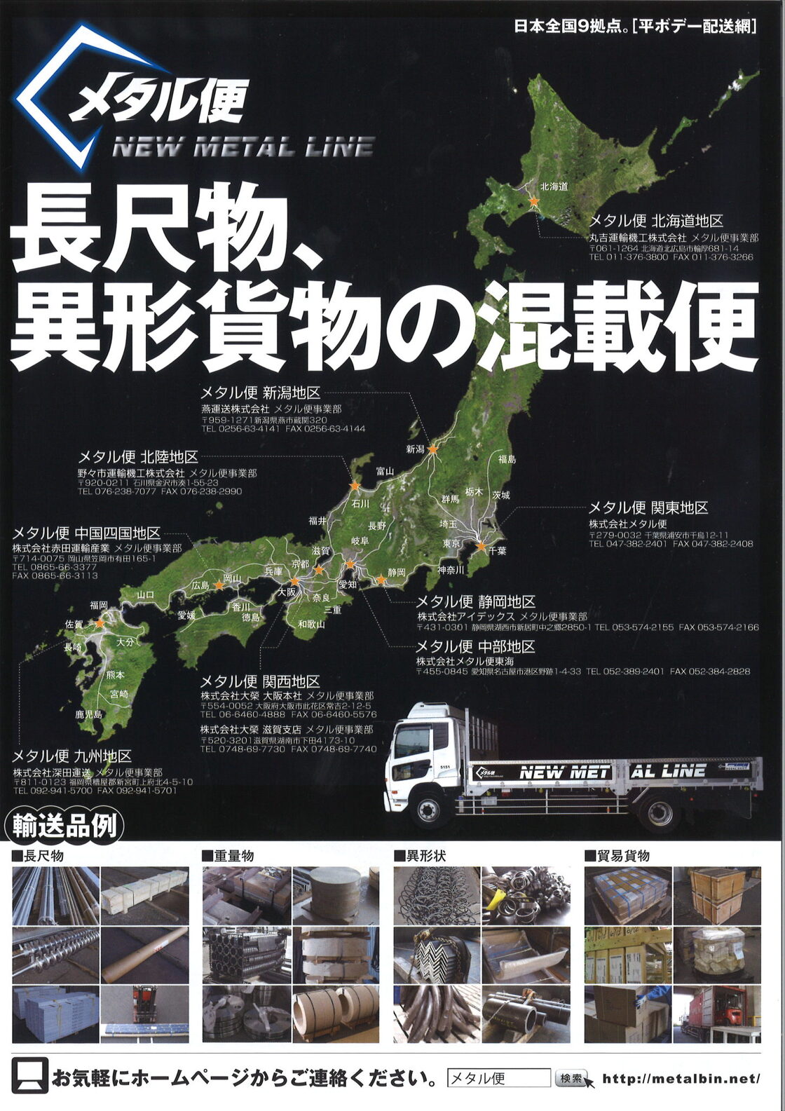 今年の6月に始まったメタル便北陸ですが、現在は鋼材、金属加工製品、木材などの様々な種類の製品を運ばせていただいています。 ご利用していただいているお客様の声として、 「チャーターより安く、コスト削減につながった。」 「今までは、遠方から長尺製品の注文があっても届ける手段が無かった。これからはメタル便を利用して営業範囲の拡大をしていく。」 という声をいただき、私たちも大変嬉しく思っています。 長尺製品の輸送でお困りの方は是非、メタル便のご利用をご検討ください。 専務取締役 吉田 章