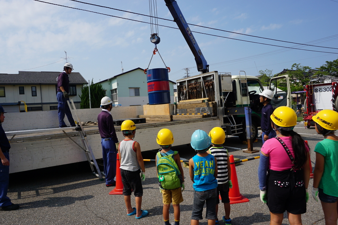みんなで押しても動かなかったドラム缶をクレーンで簡単に荷台の上に運びます。小学生からは「おぉ」と歓声が上がります。