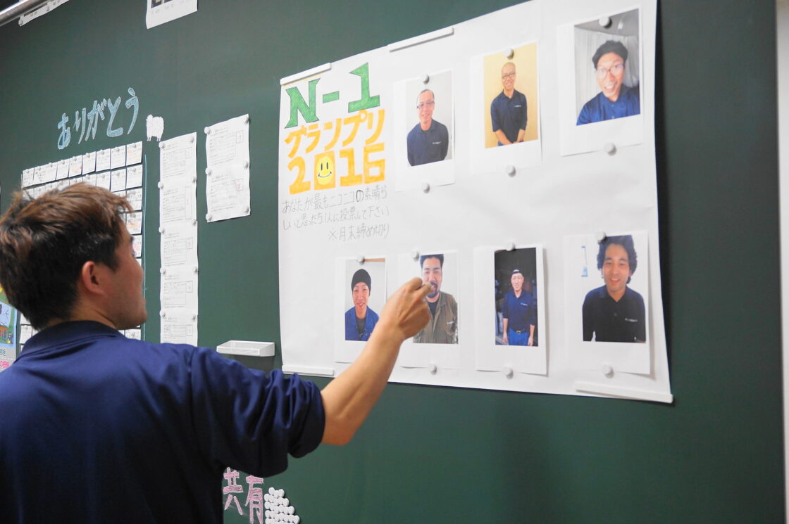 と言っても何のことかわからないと思いますが、N-1とは野々市運輸機工とニコニコ(笑顔)の頭文字のNをとって笑顔ナンバーワンをみんなで決めようという企画です。感動創造委員会が企画、運営をしてくれました。目的はお客様に製品と一緒に笑顔を届けられるようになるためです。