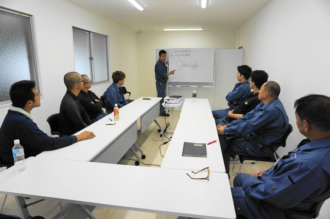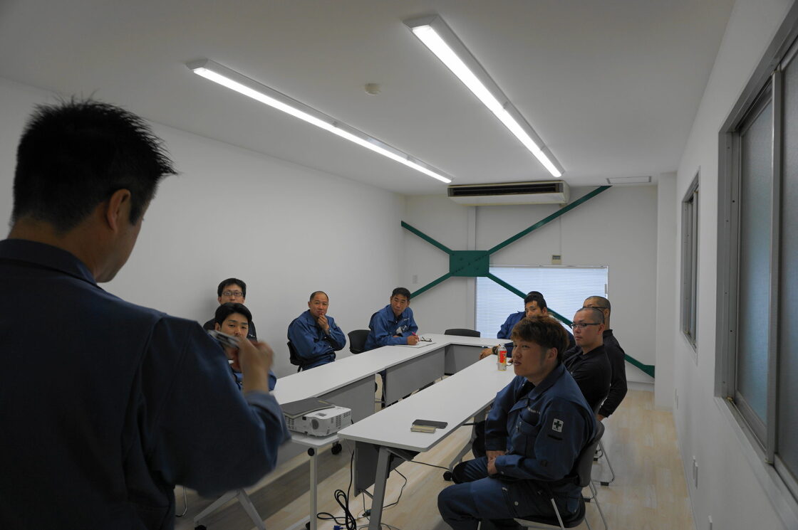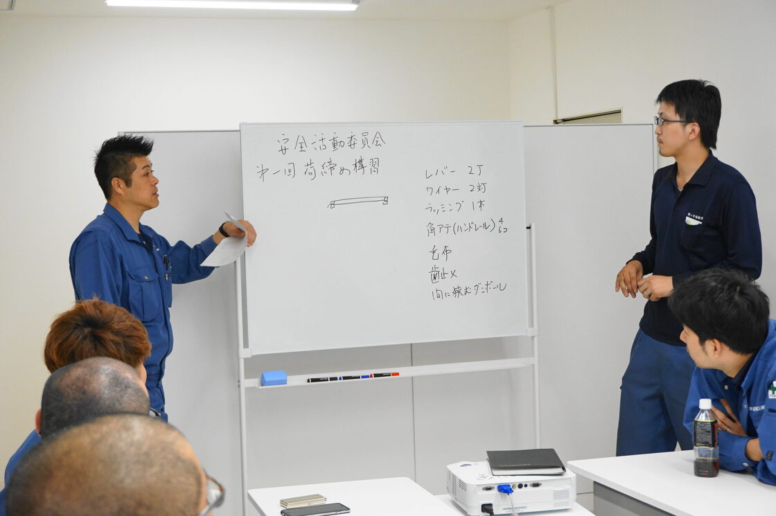 荷締めというのは製品の固定の仕方の事です。我々が取り扱う製品は荷台に載せて道具で固定せずに走行できるモノはほとんどありません。いろいろな製品があるので、ベテランの社員さんの知識を入社2、3年以内の社員さんに伝えてもらう場です。