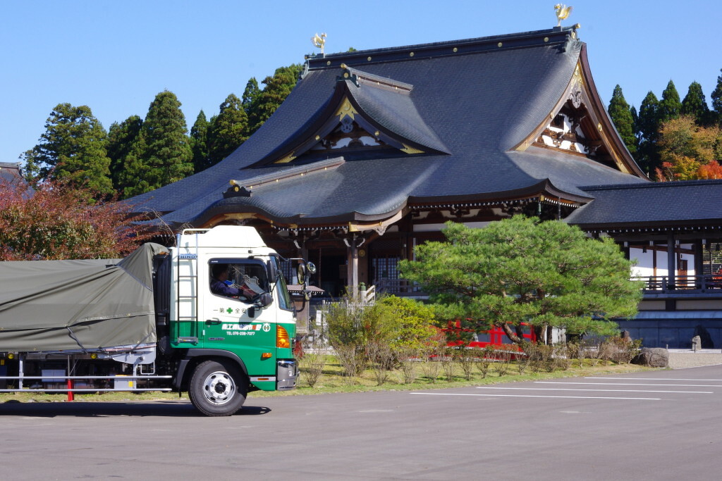 11月6日、交通安全祈願に行ってきました。 当社では車両を納車した際に必ず交通安全祈願をしていて、津幡町の倶利伽羅不動寺に行っています。交通安全祈願を行ったからといって事故が無くなるわけではありませんが、ひとつのケジメとして必要だと考えています。朝礼であったり点呼であったり、日常に対して意識的に区切りをつけることはとても大切なことです。区切りをつけることで物事にメリハリがでて活力が生まれるのだと思っています。 今回は4tの平ボデー車の安全祈願に来ました。乗車するのは高野さん。ご安全に。