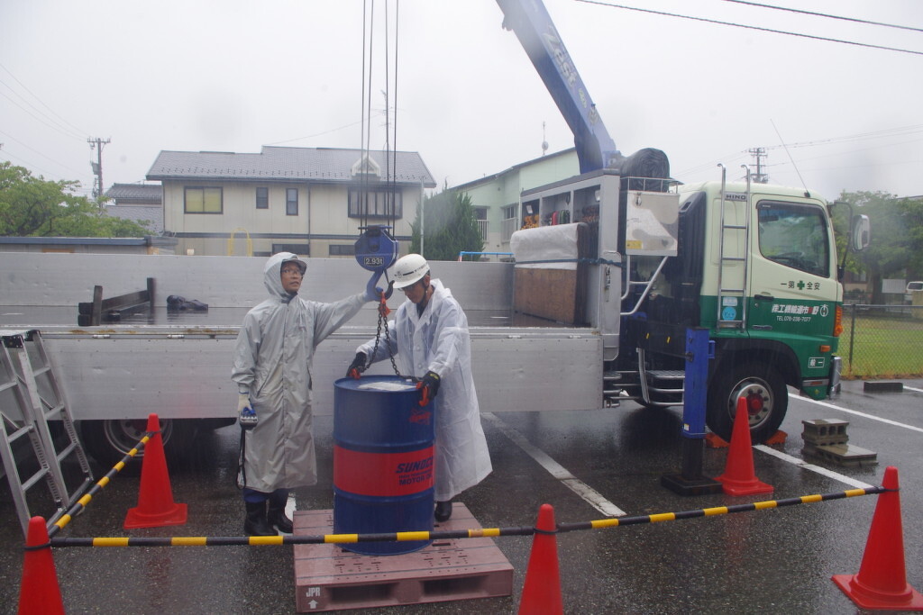 続いて実際にクレーンでドラム缶を荷台に乗せます。担当は橋田さんと狩山さん。