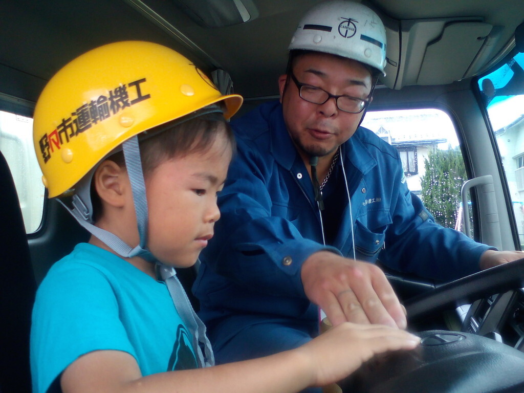 初めて運転席に乗って緊張気味。でも社員の竹内さんがやさしく教えます。