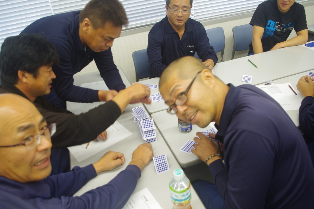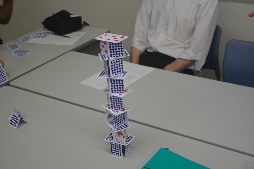 次にアイスブレイクとしてグループ対抗トランプタワー作りをしました。これは創意工夫とチームワークが重要です。ワイワイガヤガヤと話合いながらつくります。