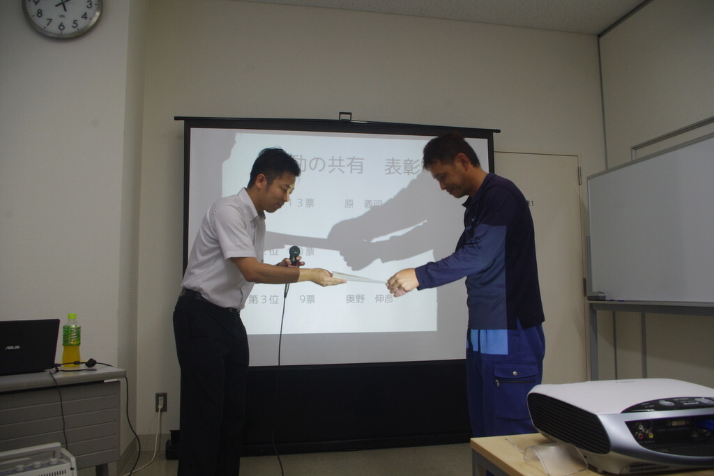 感動の共有表彰式をしました。とても素晴らしい取り組みがたくさんありました。写真は第1位の原さんです。