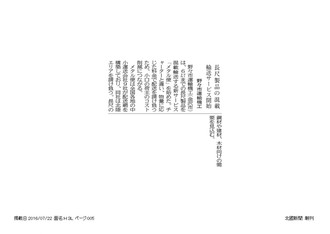 長尺製品の混載輸送サービスを開始 金沢市の野々市運輸機工 野々市運輸機工(金沢市)は、6メートルまでの長尺製品を混載輸送する新サービス「メタル便」を始めた。チャーターと違い、物量に応じた料金で配送を請け負うため、小口の荷主のコスト削減につながる。 メタル便は全国各地の中小運送会社9社が配送網を構築しており、同社は北陸エリアを請け負う。長尺の鋼材や建材、木材向けの需要を見込む。
