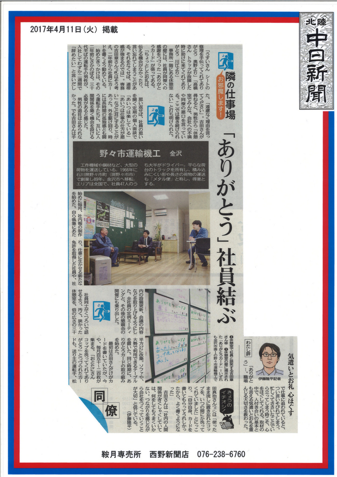 2017年4月11日、北陸中日新聞に弊社内で行なっている「ありがとうカード」の記事が掲載されました。