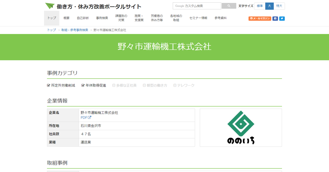 「働き方・休み方改善ポータルサイト 野々市運輸機工事例」