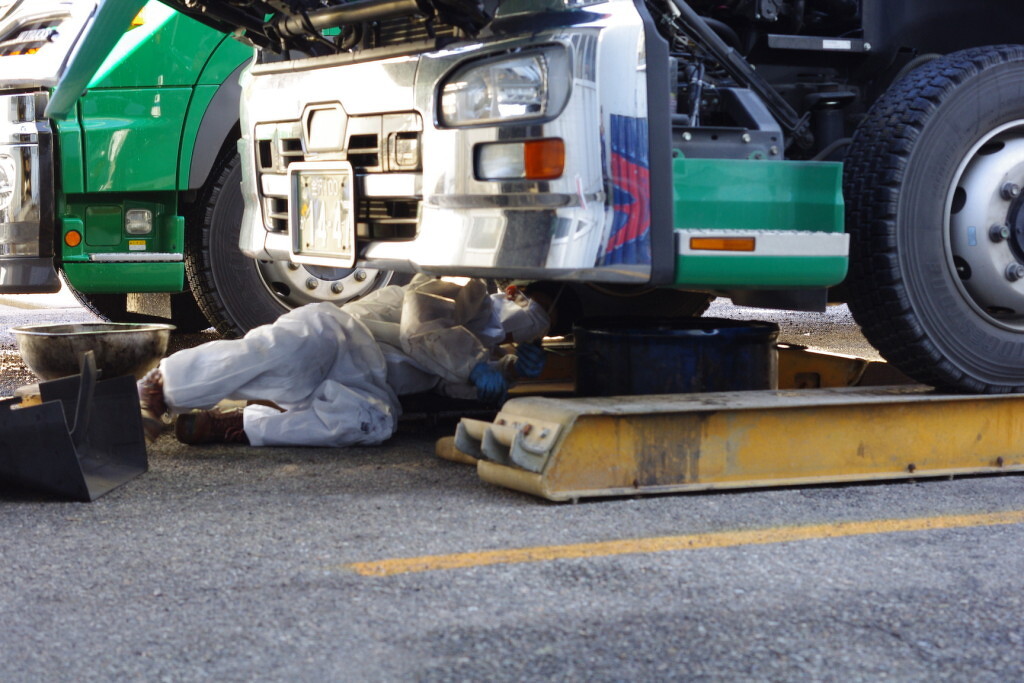 当社では定められた距離数を走行すると、ドライバーさんが自らトラックのオイルを交換しています。エンジンオイルを変えないとエンジントラブルや燃費の悪化につながります。写真のようにトラックの下に潜り込んで作業するのはけっこう大変なんです。