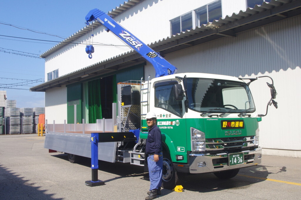 本日、新車が納車されました。クレーン付きの7tトラックです。 当社は新車をつくる時、そのトラックに乗る乗務員さんとどんな仕様にするか一緒に考えます。 「この位置にこんなモノがついてたら便利だなぁ。」 「ここを少し大きくしてほしい。」なんて言う声をひろい、つくり上げていきます。 ですから当社のトラックには歴代の社員さんの考えや思いがたくさん詰まっています。 納車されたトラックを見て「やっぱり、新車はいいなぁ」と乗務員さんはとても喜んでいました。